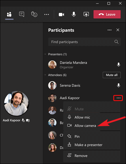 You can allow anyone to share their video once you’ve disabled cameras for meeting attendees. Go to the participant’s name in the panel and click the ‘More options’ icon. Then, click ‘Allow camera’ from the menu.