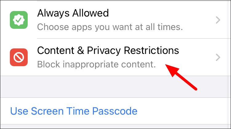 Once screen time is enabled, a lot of options will be displayed on the screen. Tap ‘Content and Privacy Restrictions’ from the list.