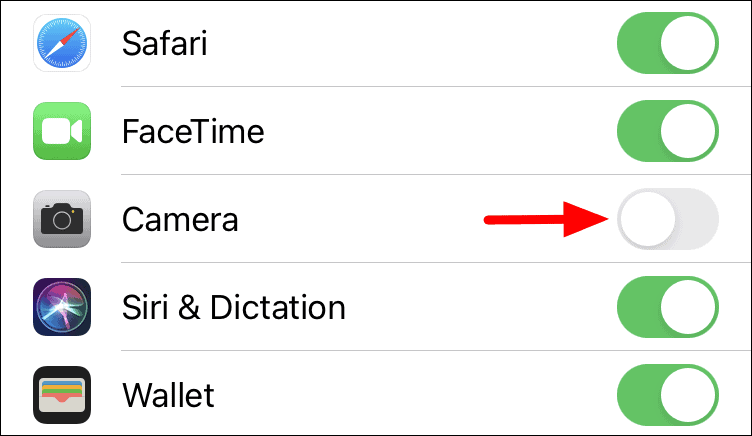 You will now see a list of apps on the screen with a toggle next to each to disable them. Locate the ‘Camera’ app in the list and then tap on the toggle next to it. After it has been disabled, the color of the toggle changes from green to light grey.