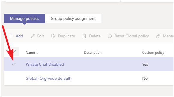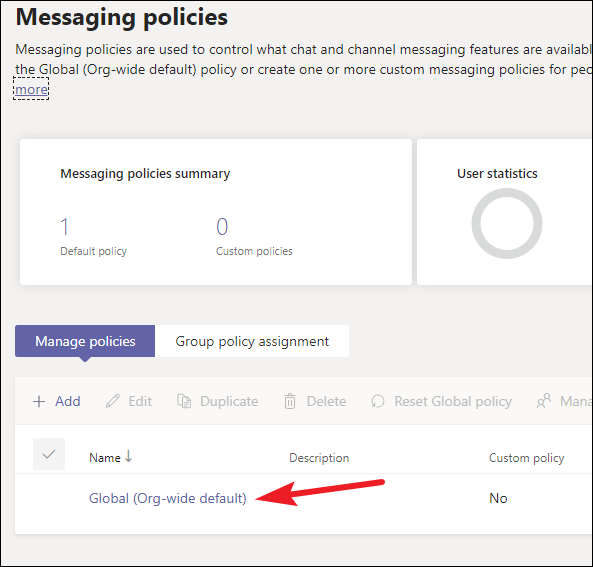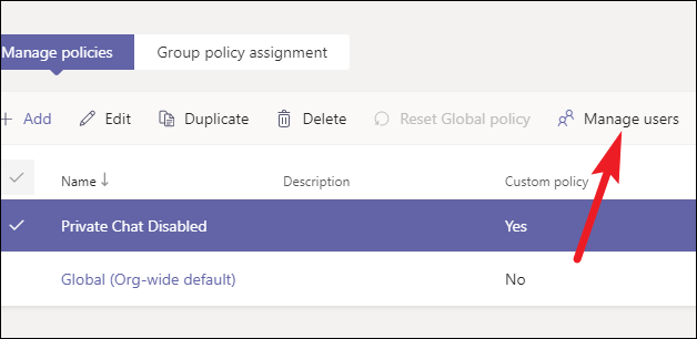After creating the policy, it’s time to assign it to the users you want to apply it to. After saving the policy, you will be automatically back on the Messaging policies screen. Go to your newly created policy, and click on the ‘check’ option to its left to select it.