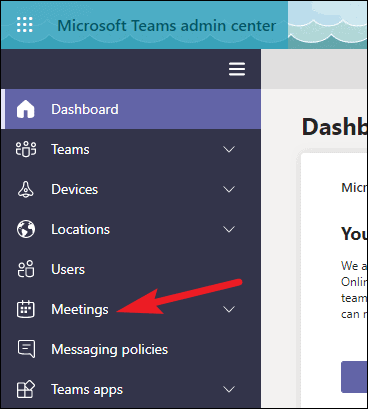 Go to admin.teams.microsoft.com and login with your admin account. Then, click on ‘Meetings’ on the navigation bar on the left. The further options available for meetings will expand underneath.