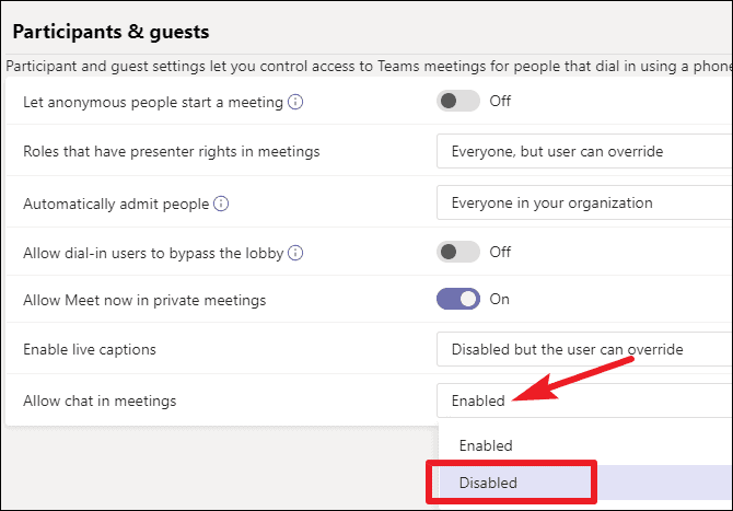 Then scroll down to the section for ‘Participants & guests’. And click on the drop-down menu next to ‘Allow chat in meetings’. Select ‘Disabled’ from the list.
