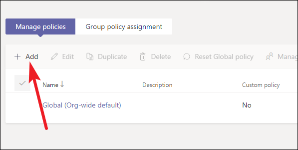 The existing messaging policies, default, and custom (if any), will open. Click on the ‘Add’ option to create a new custom policy.