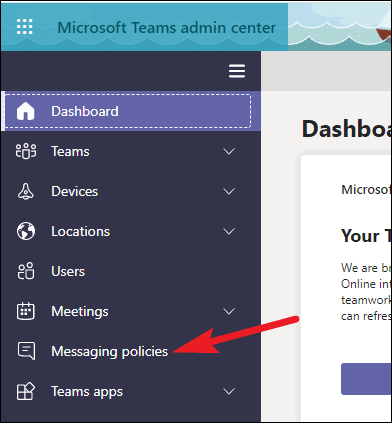 Go to admins.teams.microsoft.com and log in with your Microsoft account. The admin dashboard will open. From the navigation menu on the left, click on ‘Messaging Policies’.