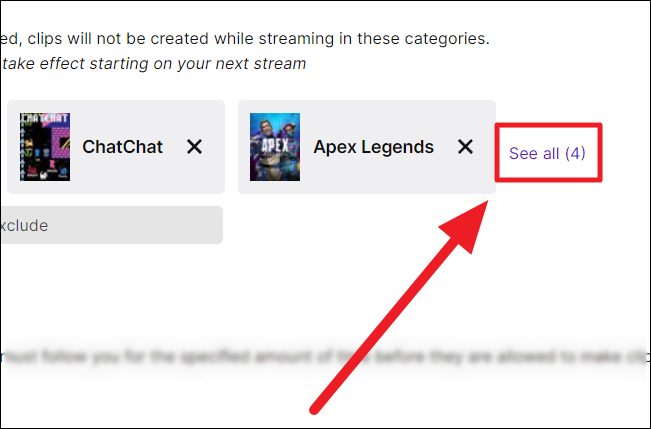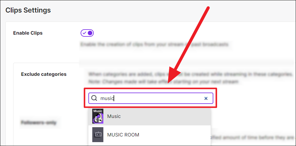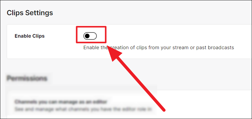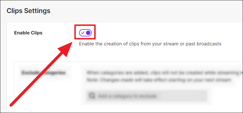 If you don’t mind viewers creating clips on your streams except in particular categories, this option is for you. First, ensure the ‘Enable Clips’ toggle is purple — this suggests the feature is ON. If it is disabled, click the toggle to turn it purple.