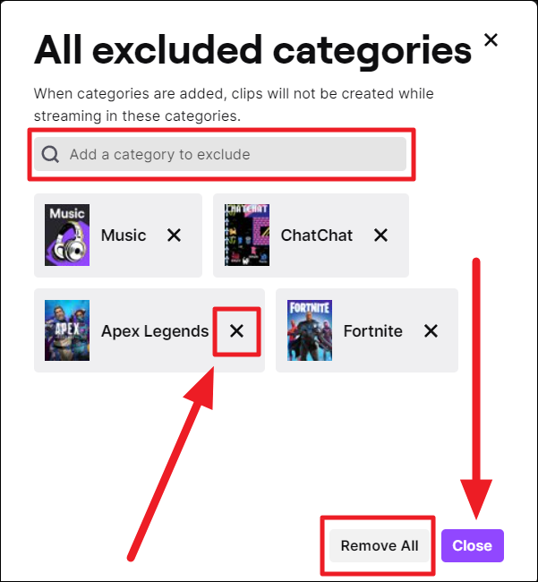 If you want to erase all your categories, click the ‘Remove all’ button. If not, click the ‘X’ button on individual category boxes to remove them. Hit the ‘Close’ button once done.