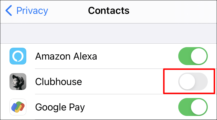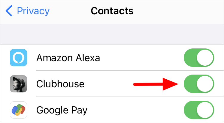 Next, tap on the toggle right next to the ‘Clubhouse’ option to disable contact access on Clubhouse.