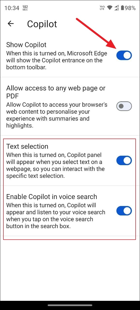 - To disable Copilot, turn off all the options inside the Copilot page, such as 'Show Copilot', 'Text Selection', and 'Enable Copilot In Voice Search' by clicking on the respective buttons.
