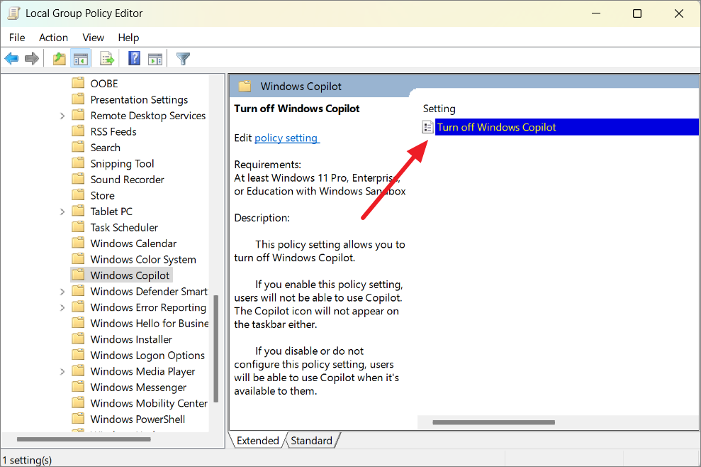 If your computer has Windows 11 Pro, Enterprise, or Education editions, you can permanently disable Copilot from the Local Group Policy Editor.