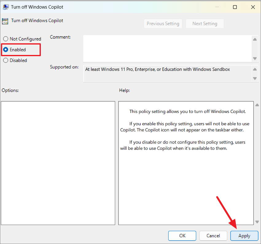 To re-enable Windows Copilot, follow the same steps and select 'Not configured' or 'Disabled'. Then, click 'Apply' and 'OK'.