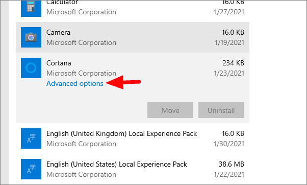 Now, scroll down and search for Cortana under the list of apps. After you find Cortana, click on it, and then select ‘Advanced options’.