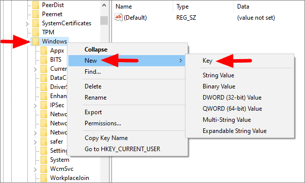 Look for ‘Windows Search’ in the sidebar on the left. If you can’t find it, right-click on Windows, select ‘New’, and then click on ‘Key’ from the menu.