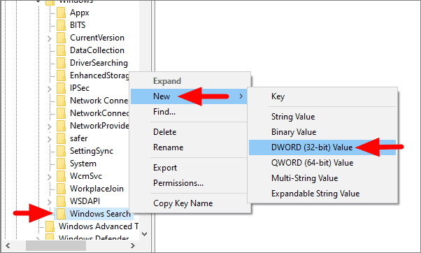 Enter ‘Windows Search’ as the key name, once it is visible in the sidebar.
