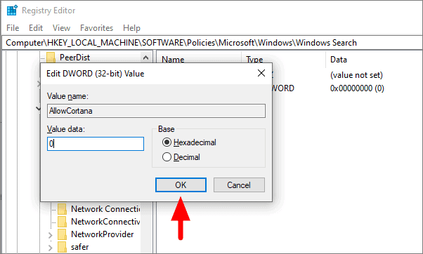 If Cortana isn’t disabled yet, check if you have followed the steps carefully, and ensure value data is set to 0.