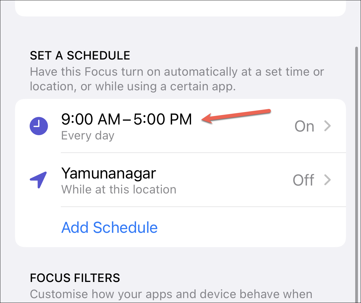 Scroll down and tap the option displayed under ‘Set a Schedule’. It could be for a time, location, or an app. For this example, let’s say, you have a schedule set for DND; tap it to open it.