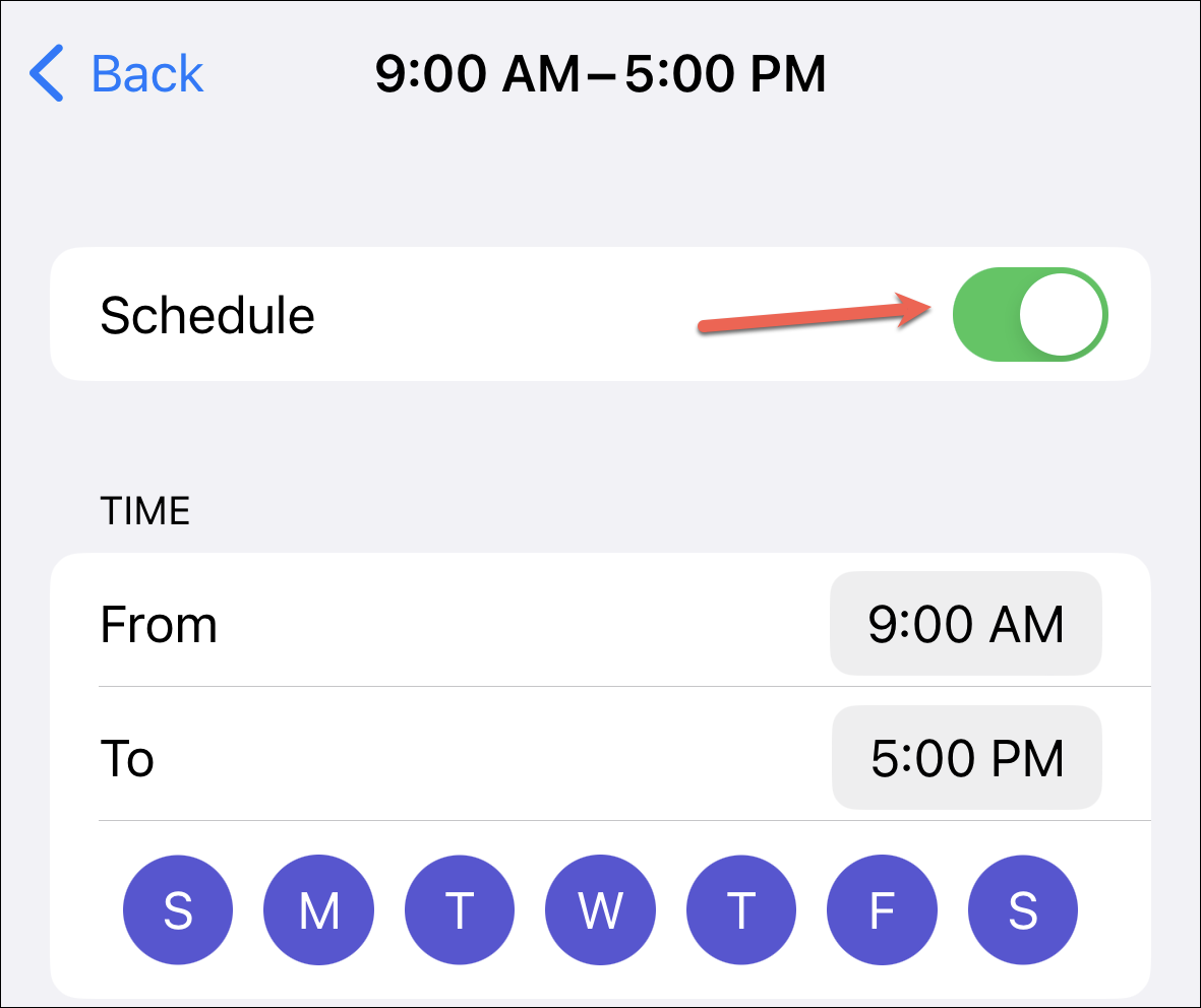 Then, turn off the toggle next to ‘Schedule’ to disable it completely. You can also change the timings if DND keeps turning on at the wrong time.