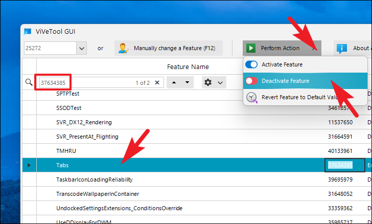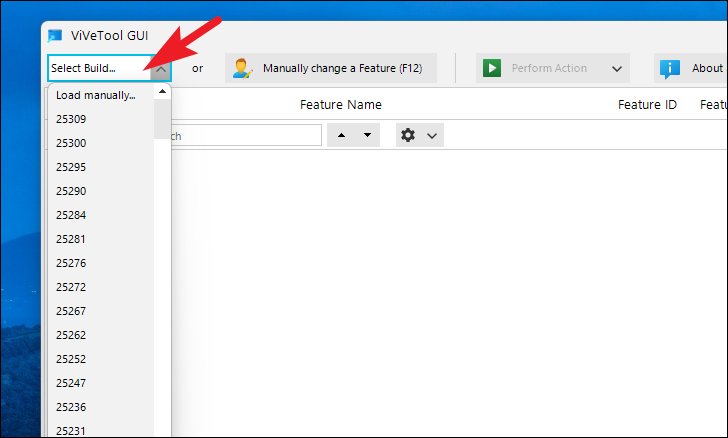 Step 6: In the ViveTool GUI window, select your Windows build version from the dropdown menu at the top. This will display a list of features available for your system.