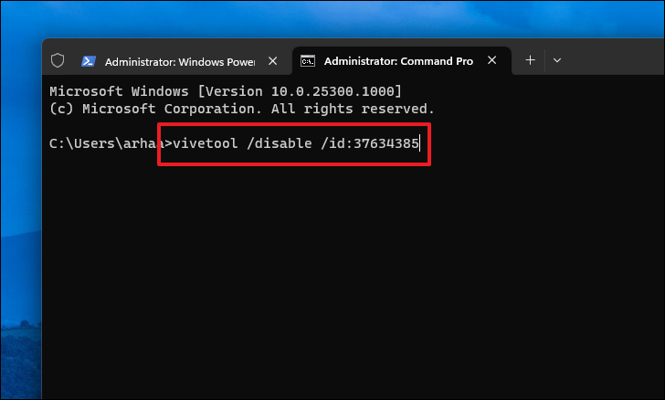 vivetool /disable /id:37634385vivetool /disable /id:36354489