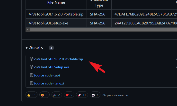 Step 1: Download the ViveTool GUI from its GitHub page. Click on the .ZIP file under the Assets section to start the download.