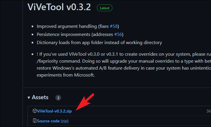 Step 1: Download the ViveTool ZIP file from its GitHub page. Click on the .ZIP file under the Assets section to initiate the download.