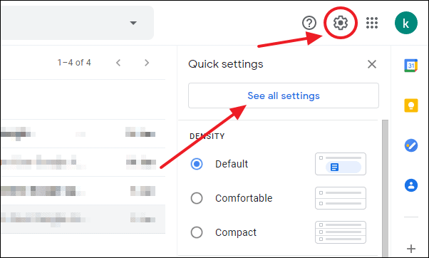 When logged into your Gmail account, glance through the top panel and click on ‘Settings’. Look for the gear icon (as seen in the image below) and then click on the ‘See all settings’ button.
