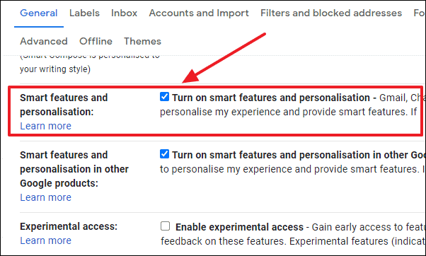 From the Settings menu, select the ‘General’ tab and scroll down to scan through the options. Look for the ‘Smart features and personalization’ option and click on the check box beside the feature to turn it off.