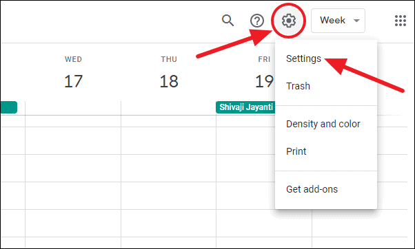 When signing in look for the ‘Settings’ option in the Google Calendar. The Settings option should be available in the top panel, look for a gear icon beside the calendar view options. Click on the gear icon and then select ‘Settings’ from the available options.