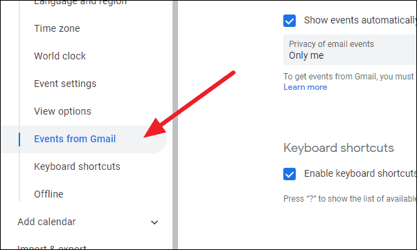 When in the Google Calendar settings menu, look through the left panel and select ‘Events from Gmail’. It will be grouped under General tab.