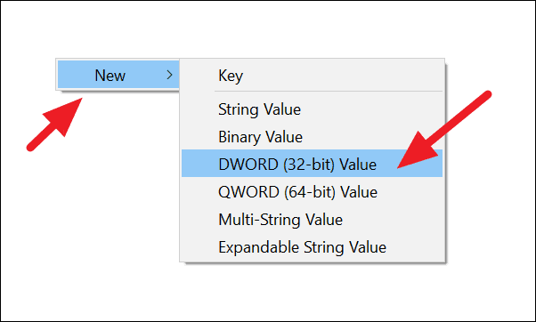 Right-click in the white space of ‘Registry Editor’ to see the ‘New’ option and then select ‘DWORD (32-bit) Value’.