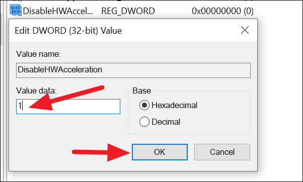 Name the new registry we created ‘DisableHWAcceleration’ or anything of your choice. Just remember the name for any future use. Double-click on it, enter ‘1’ in ‘Value data’ box, and click on the ‘OK’ button.