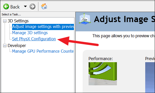 In the ‘NVIDIA Control Panel’, click on ‘Set PhysX Configuration’ from the left-side bar.