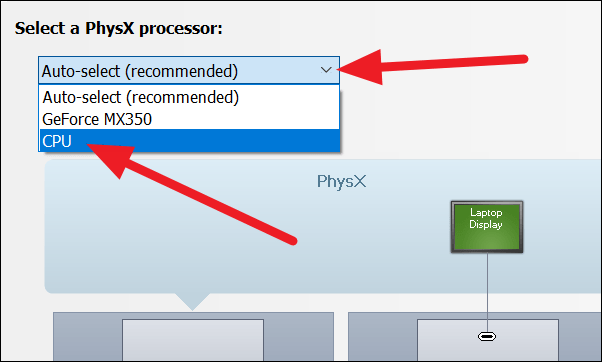 You will now see the option to select the PhysX processor. Click on the drop-down button (as seen in the image) and select CPU.