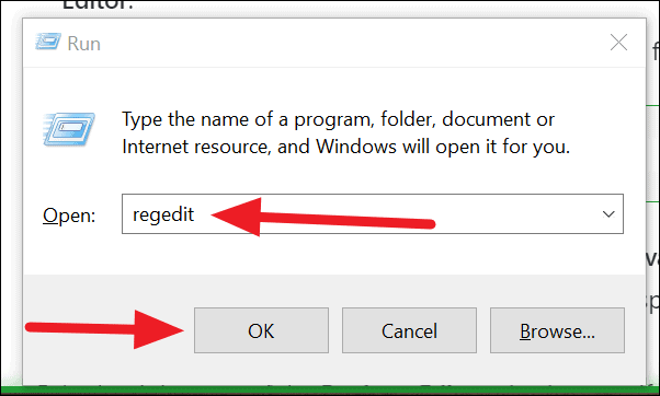 To access Registry Editor, press Windows key+R, type regedit in the ‘Run’ text box and click on the ‘OK’ button.