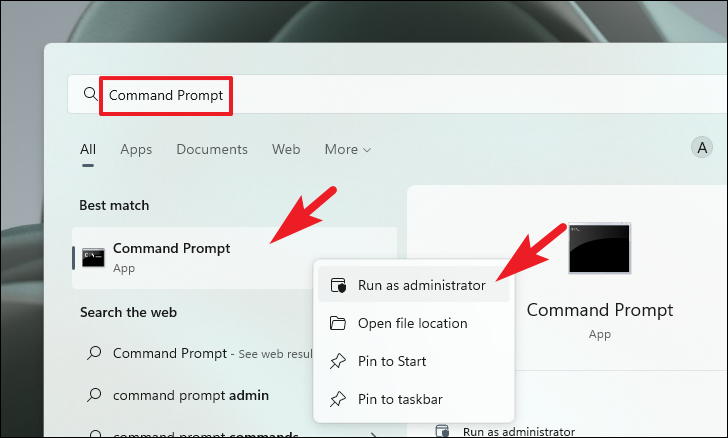 Step 1: Open the Start menu and type Command Prompt in the search bar. Right-click on the Command Prompt app and select Run as administrator.