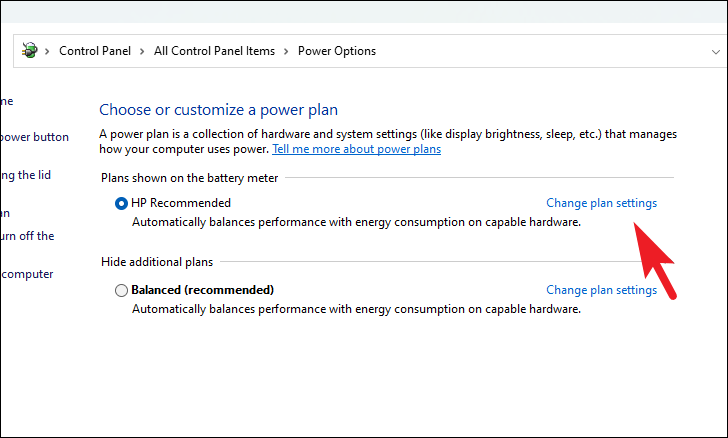 Step 3: Find your active power plan and click on Change plan settings next to it.