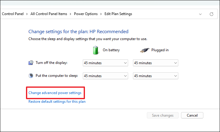 Step 4: Click on Change advanced power settings to open the Advanced settings window.