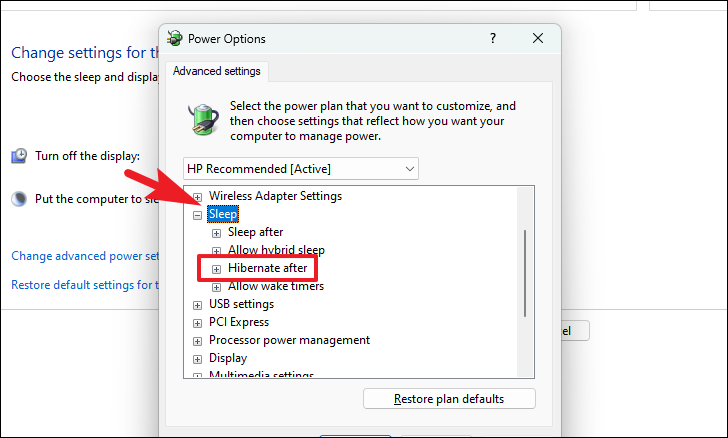 Step 5: In the Advanced settings, expand the Sleep category by clicking the plus sign. Then, expand Hibernate after.