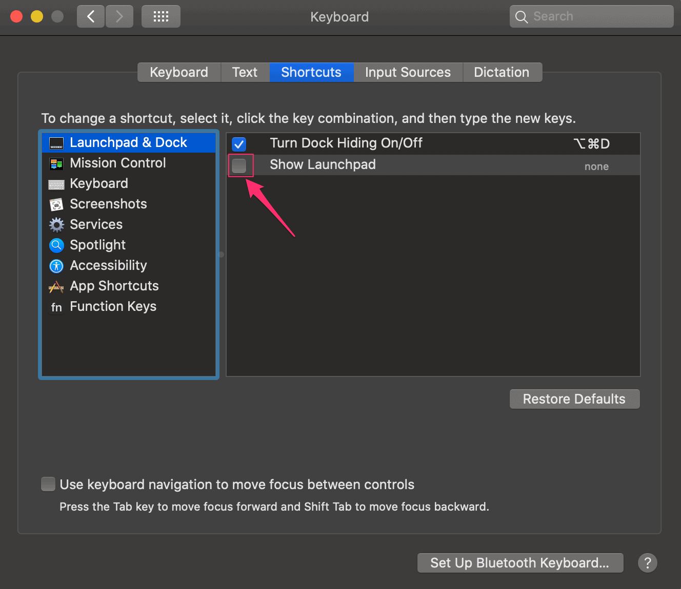 Under Keyboard settings, go to the ‘Shortcuts’ tab and select ‘Launchpad & Dock’ from the left panel. Then uncheck the box for ‘Show Launchpad’ to disable the keyboard for it. This is only for users who have changed this setting previously because the box is unchecked in the default settings.