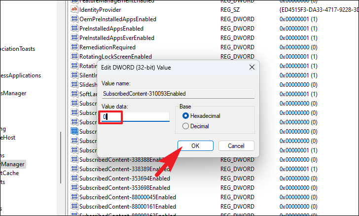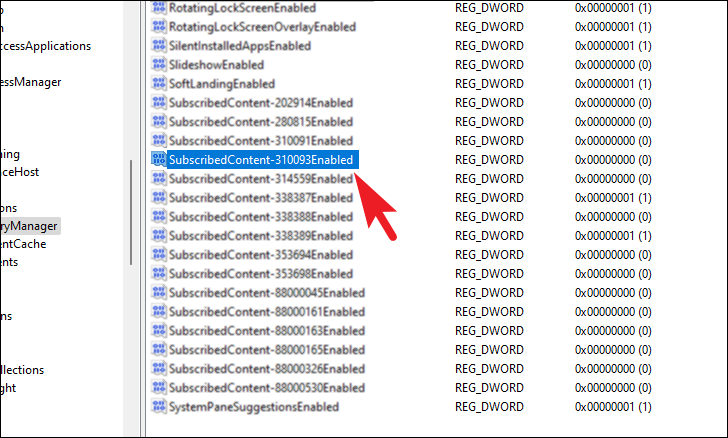 Step 6: Double-click on the SubscribedContent-310093Enabled value to modify it.