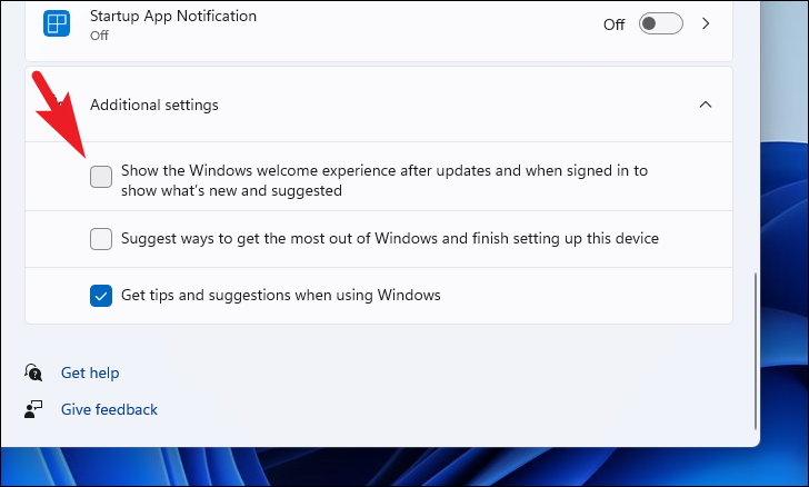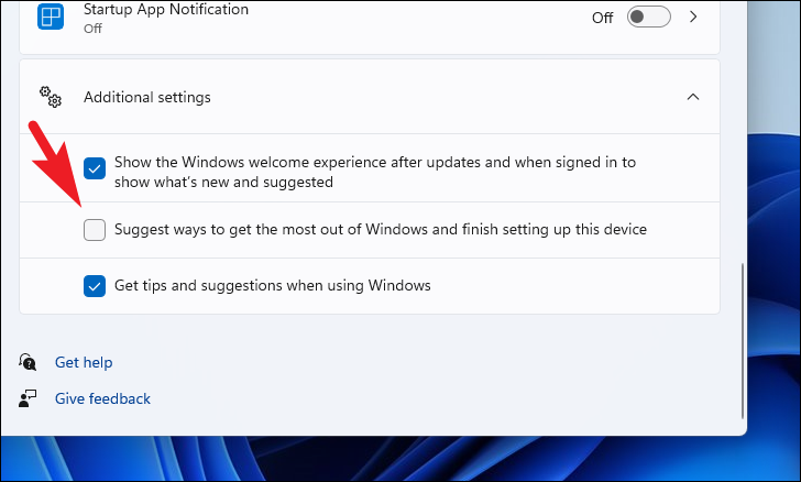 Step 4: Scroll down to the bottom of the Notifications settings and locate the Additional settings section. Uncheck the box next to "Suggest ways to get the most out of Windows and finish setting up this device".