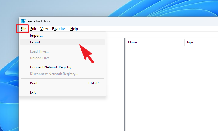 Step 2: In the Registry Editor, click on File in the top-left corner and choose Export to create a backup of the registry.