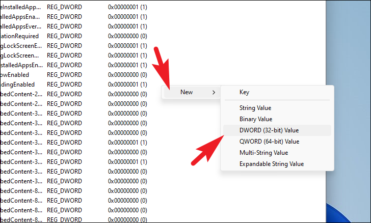 Step 5: In the right pane, right-click on an empty space, select New, and choose DWORD (32-bit) Value. Name this new value SubscribedContent-310093Enabled.