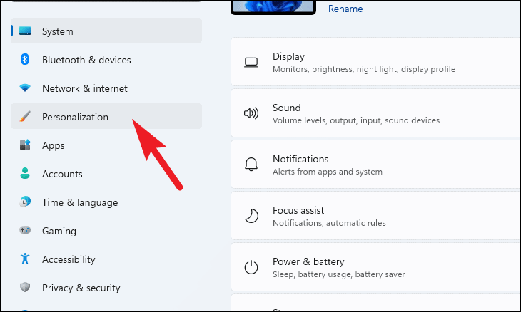Next, click on the personalization tab present on the left sidebar of the Settings window.