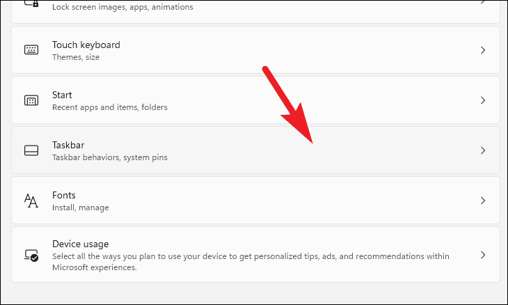 Now, scroll down to locate and click on the ‘Taskbar’ tile from the right section of the window.