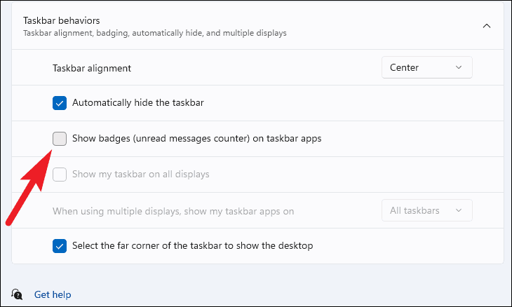 Next, click the checkbox preceding the ‘Show badges on taskbar apps’ option to uncheck.