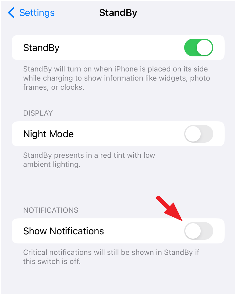 - Under StandBy settings, turn off the toggle switch next to 'Show Notifications' option.