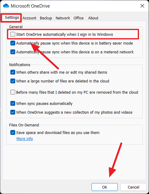 Step 3: In the Settings window, under the Settings tab, uncheck the box for Start OneDrive automatically when I sign in to Windows, then click OK.