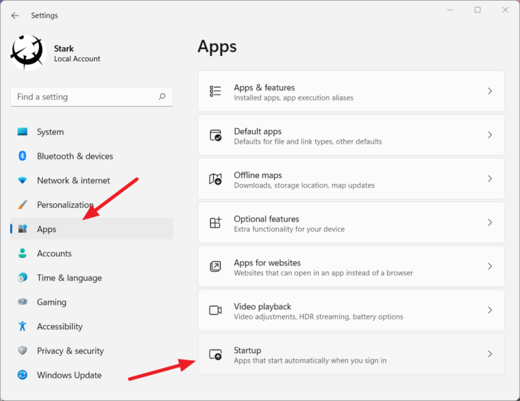 Step 2: Click on Apps in the sidebar, then select Startup on the right.