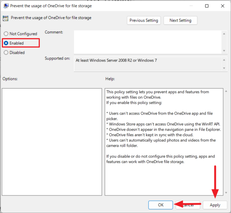 Step 4: In the settings window, choose Enabled, then click Apply and OK to save the changes.