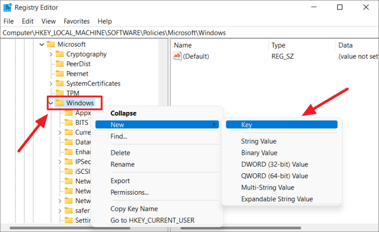 HKEY_LOCAL_MACHINE\SOFTWARE\Policies\Microsoft\Windows\OneDriveStep 3: If the OneDrive key doesn't exist, right-click on the Windows key, select New > Key, and name it OneDrive.
